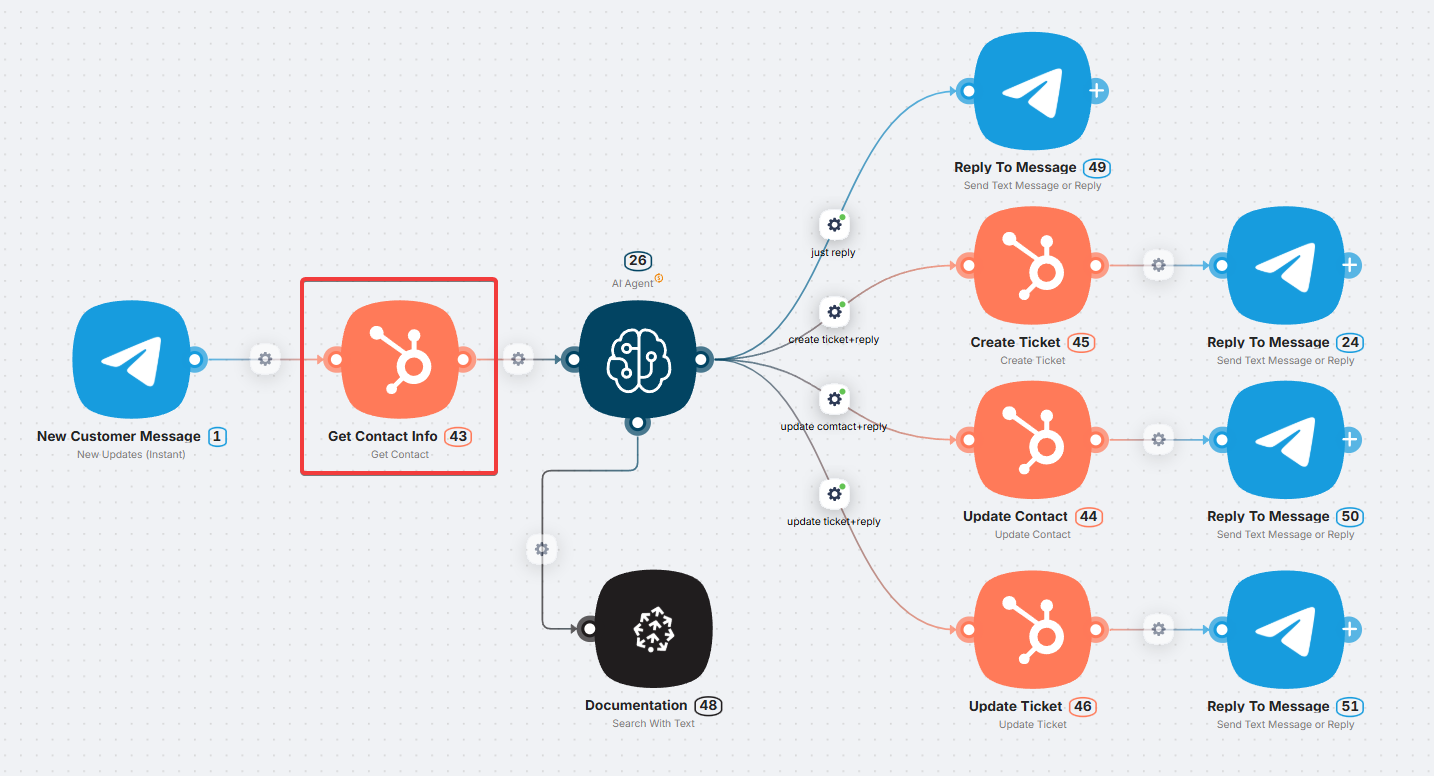 The scenario reads the JSON and automatically performs the required actions - creates a ticket, logs the request, replies to the customer, assigns a team, and so on. In this case, the agent did only the “thinking”, while the rest of the scenario handled the execution.