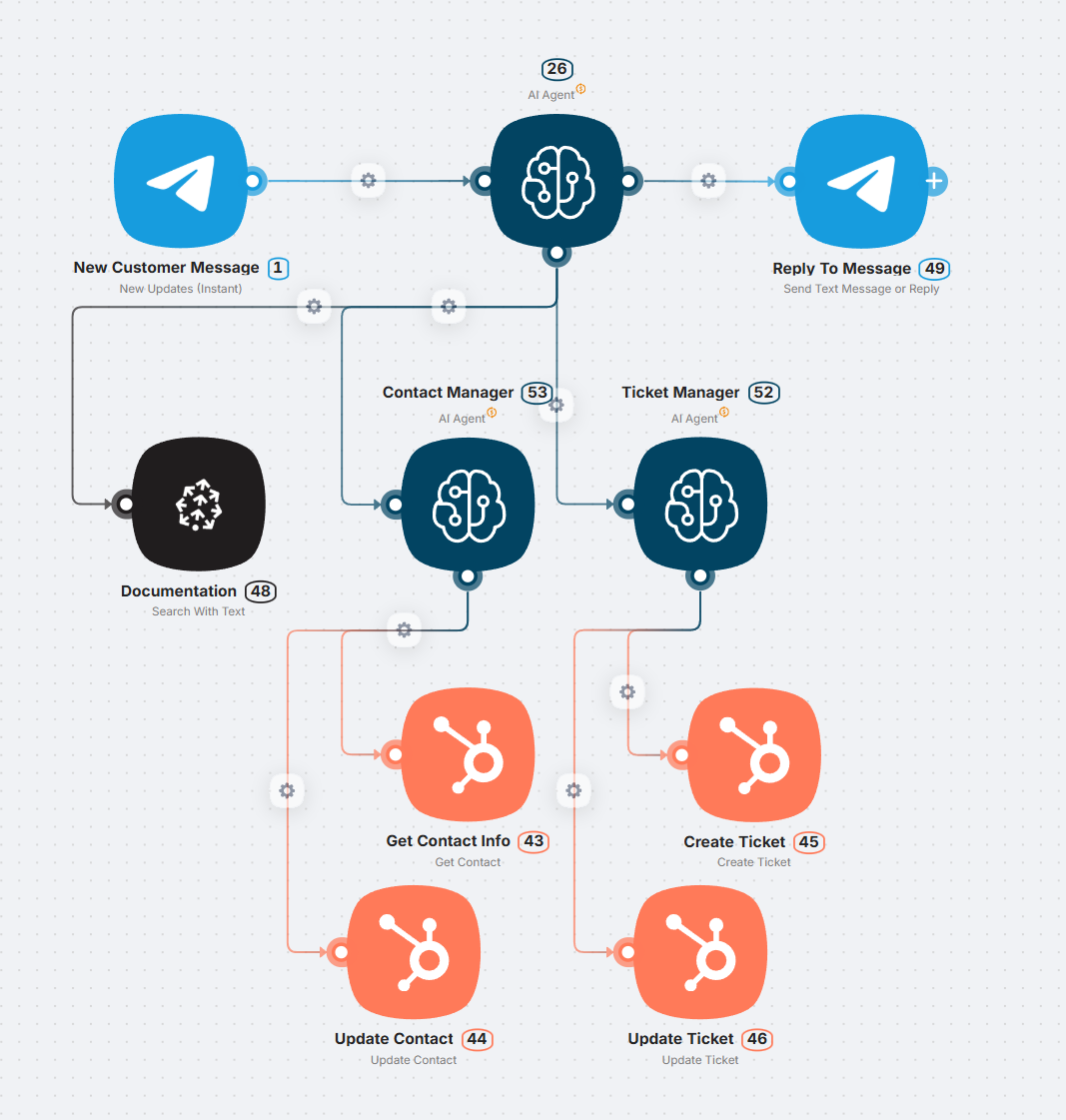The main agent calls specialized sub-agents that handle specific tasks. For example, the account management agent only has access to Get Contact Info and Update Contact, while the ticketing agent can use Create Ticket and Update Ticket, and so on.
