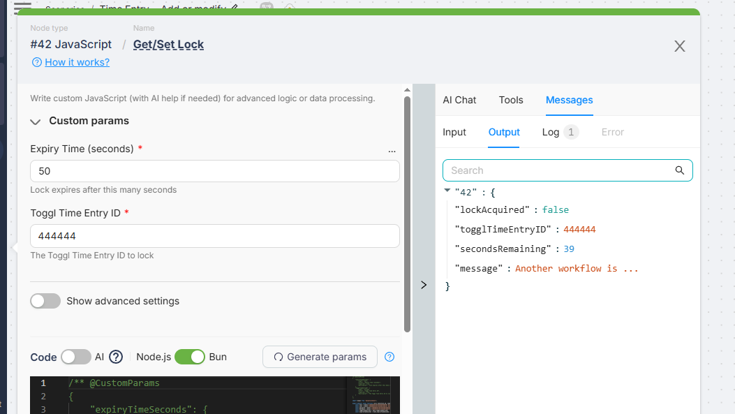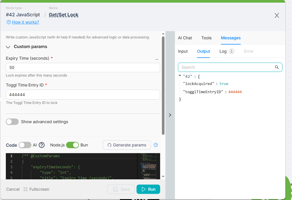 I have a JS node that sets the lock in an SQL database for a specific toggl ID that is syncing from the webhook. If that node returns lockAquired as true then I’d continue the path. If it returns as false that means there is already a lock for that ID in the database. Then I’d want it to wait for 10 seconds, and run that JS again. Continually looping until the lock is gone (the JS script has an auto cleanup incase a lock has been there longer than a minute it assumes it errored.