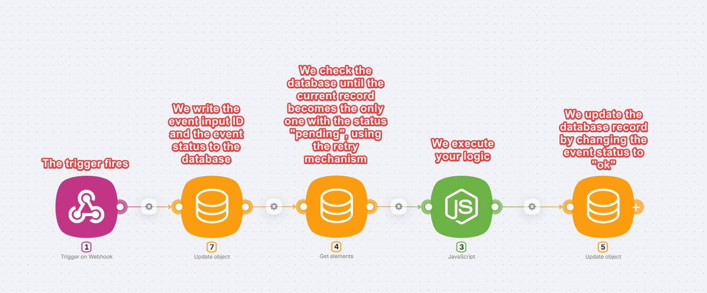 After successful execution, we update the database record and change the event status to “ok”, so that subsequent runs ignore it and proceed to the next records with the status “pending”, if any exist.