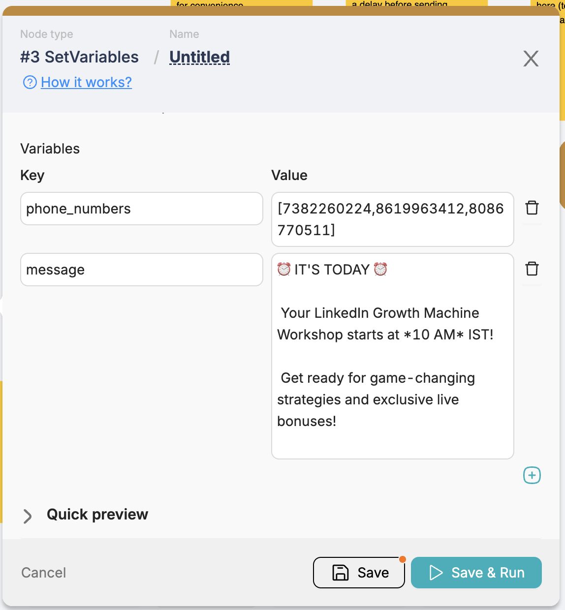 I have setup the automation on whatsapp to send messages through my personal whatsapp number. But I am able to personalize it like I am unable to add First name in the starting of the message.